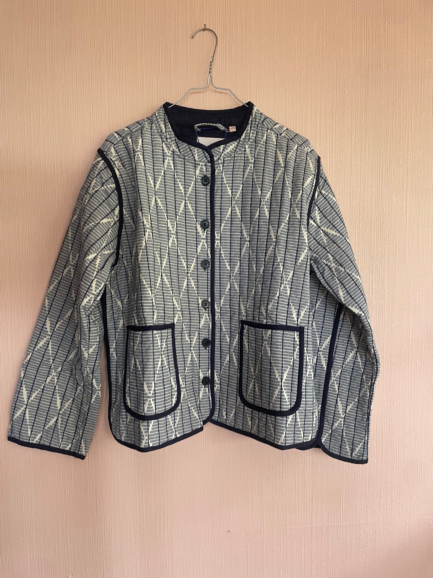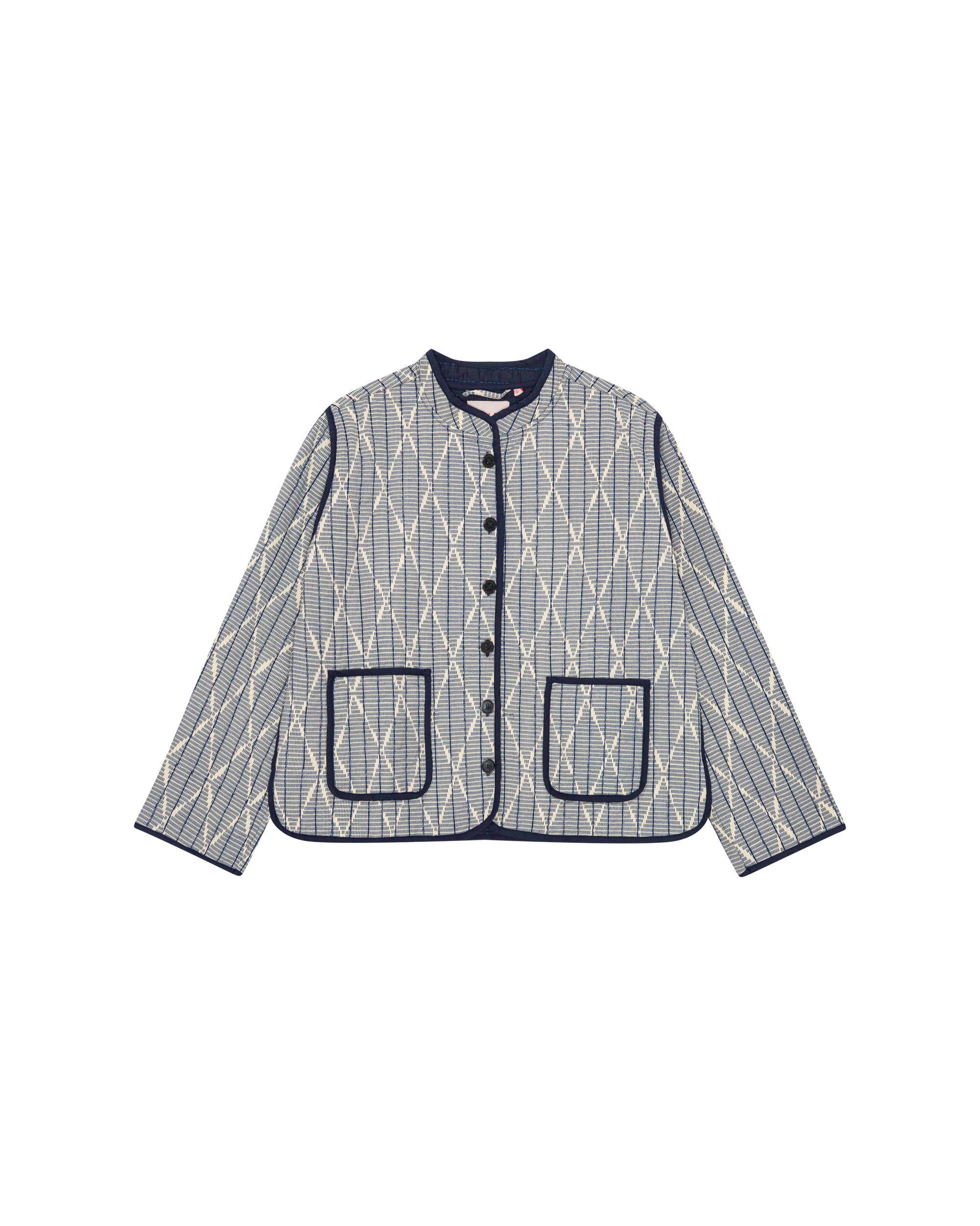 We have always been fascinated by the tecnique of the ikat weavings and the amazing results. This print is a hand drawn ikat pattern, which has been printed on a structured cotton quality, to obtain an authentic look. In combination with the special indigo quilt stitches and the indigo contrast edges it is modern and at the same time with a feeling of borrowing a piece of history from another culture.