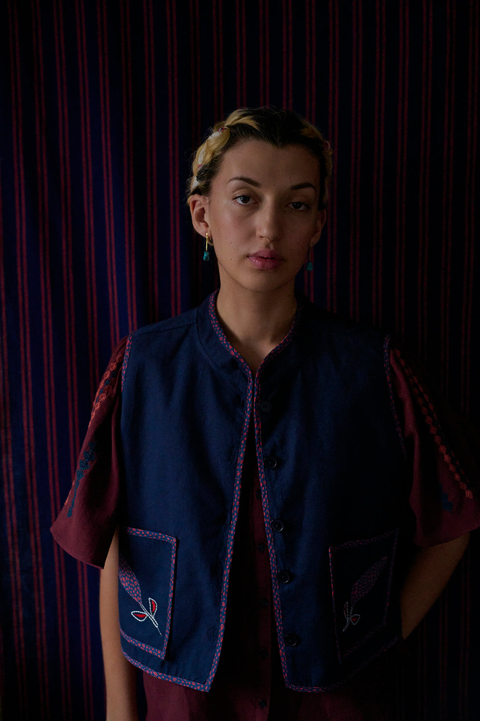 The short waistcoat has a loose fit . It has contrast edges and china collar. It is easy to combine with both dresses, shirts and t-shirts.